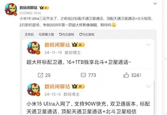 之前还有相关爆料,比如标配天通卫星通话,顶配支持天通卫星通话和北斗短信。不知道小米 15 Ultra 会不会是2025年第一款超大杯影像旗舰手机了。